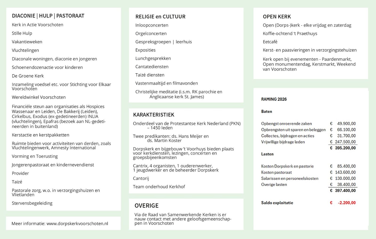 - het (diaconaal) pastoraatschap wordt vervuld - kinderen en tieners op diverse manieren kunnen meedoen - (jong) volwassenen aan gesprekskringen en activiteiten kunnen deelnemen - er activiteiten voor ouderen zijn - muziek en zang een centraal onderdeel is van ons kerk-zijn - de Dorpskerk en ’t Voorhuys worden onderhouden - de energierekening kan worden betaald - wij een Groene Kerk zijn Kortom, met uw bijdrage kunnen we blijven bestaan. Hebben we een kerkgebouw en zalen ter beschikking. En kunnen we voor en met u kerkdiensten en andere activiteiten organiseren. Het overzicht hiervan treft u in de bijlage aan. Richtbedrag voor uw bijdrage Als richtbedrag voor 2026 geldt een bijdrage van 1% van het netto-inkomen. De gemiddelde opbrengst van vorig jaar per deelnemer bedroeg €364,- We vragen u hier rekening mee te houden en uw gift zo mogelijk te verhogen mede als gevolg van de prijsstijgingen. Vanzelfsprekend bepaalt u zelf wat u kunt en wilt geven. De raming van de PGV voor 2026 is in de bijlage opgenomen. Nadere informatie Wij zijn onderdeel zijn van de Protestantse Kerk in Nederland (PKN). De PKN helpt lokale kerken en heeft daarvoor een eigen organisatie. Hiervoor moeten we wel een bijdrage betalen. Ook moeten wij een bijdrage betalen voor gemeenteleden die alleen bij ons staan ingeschreven en niet actief zijn. Op www.kerkbalans.nl vindt u meer algemene informatie! |