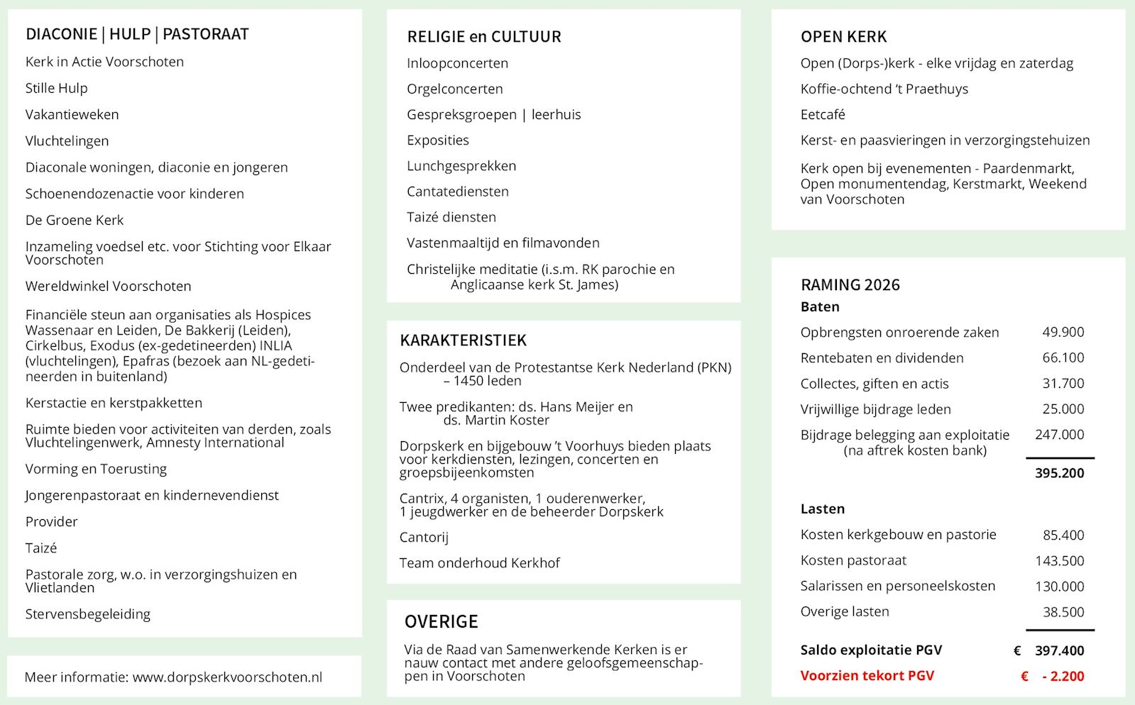 - het (diaconaal) pastoraatschap wordt vervuld - kinderen en tieners op diverse manieren kunnen meedoen - (jong) volwassenen aan gesprekskringen en activiteiten kunnen deelnemen - er activiteiten voor ouderen zijn - muziek en zang een centraal onderdeel is van ons kerk-zijn - de Dorpskerk en ’t Voorhuys worden onderhouden - de energierekening kan worden betaald - wij een Groene Kerk zijn Kortom, met uw bijdrage kunnen we blijven bestaan. Hebben we een kerkgebouw en zalen ter beschikking. En kunnen we voor en met u kerkdiensten en andere activiteiten organiseren. Het overzicht hiervan treft u in de bijlage aan. Richtbedrag voor uw bijdrage Als richtbedrag voor 2026 geldt een bijdrage van 1% van het netto-inkomen. De gemiddelde opbrengst van vorig jaar per deelnemer bedroeg €364,- We vragen u hier rekening mee te houden en uw gift zo mogelijk te verhogen mede als gevolg van de prijsstijgingen. Vanzelfsprekend bepaalt u zelf wat u kunt en wilt geven. De raming van de PGV voor 2026 is hieronder opgenomen. Nadere informatie Wij zijn onderdeel zijn van de Protestantse Kerk in Nederland (PKN). De PKN helpt lokale kerken en heeft daarvoor een eigen organisatie. Hiervoor moeten we wel een bijdrage betalen. Ook moeten wij een bijdrage betalen voor gemeenteleden die alleen bij ons staan ingeschreven en niet actief zijn. Op www.kerkbalans.nl vindt u meer algemene informatie! | ||
