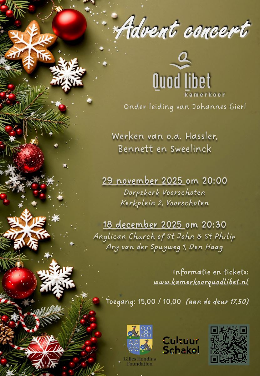 ![]() Na 7 jaar weer terug in Voorschoten: kamerkoor Quod Libet. Op zaterdagavond 29 november om 20.00 uur geeft het Haagse kamerkoor Quod Libet o.l.v. Johannes Gierl een bijzonder Adventsconcert in de Dorpskerk in Voorschoten. | ||